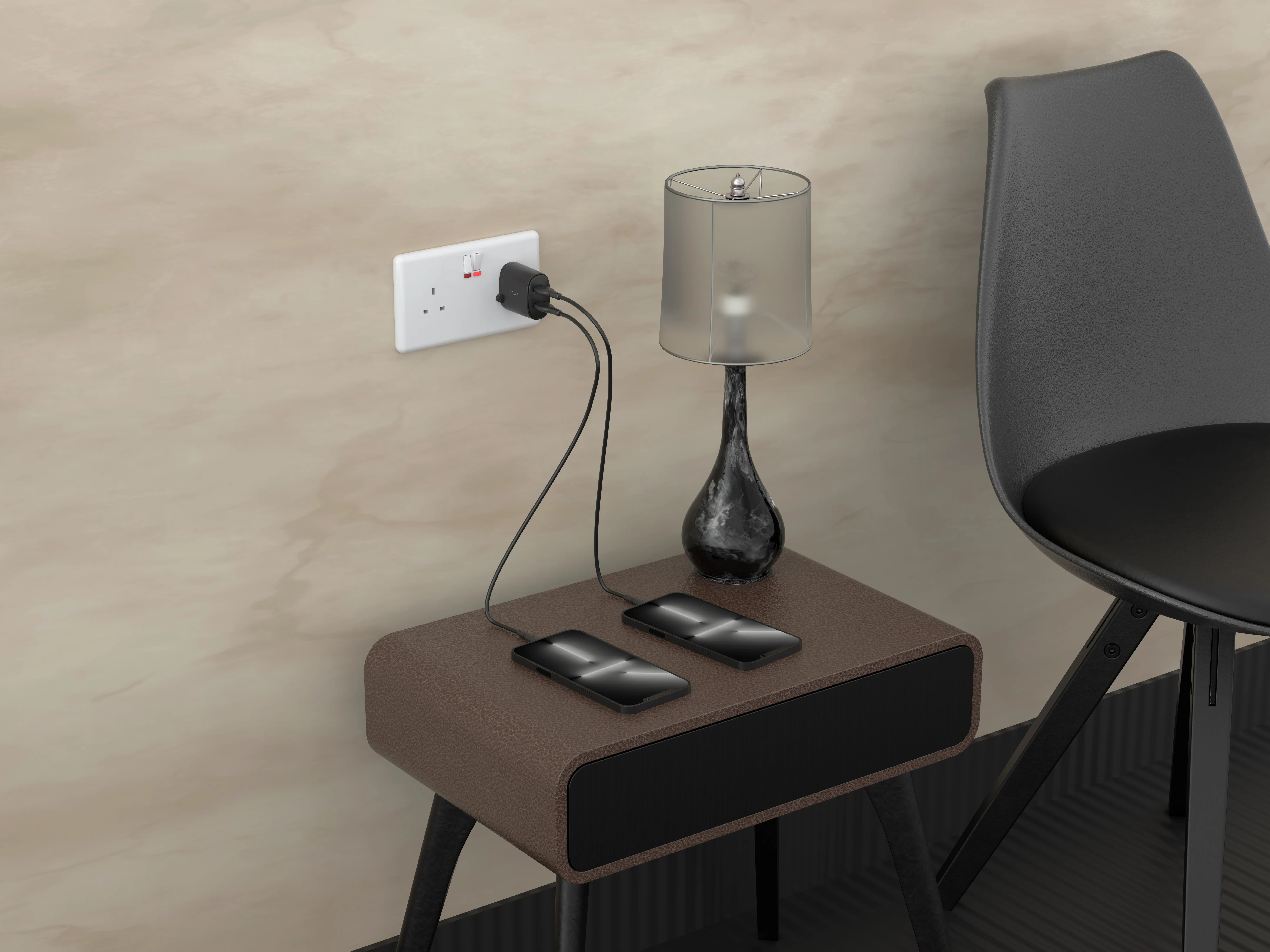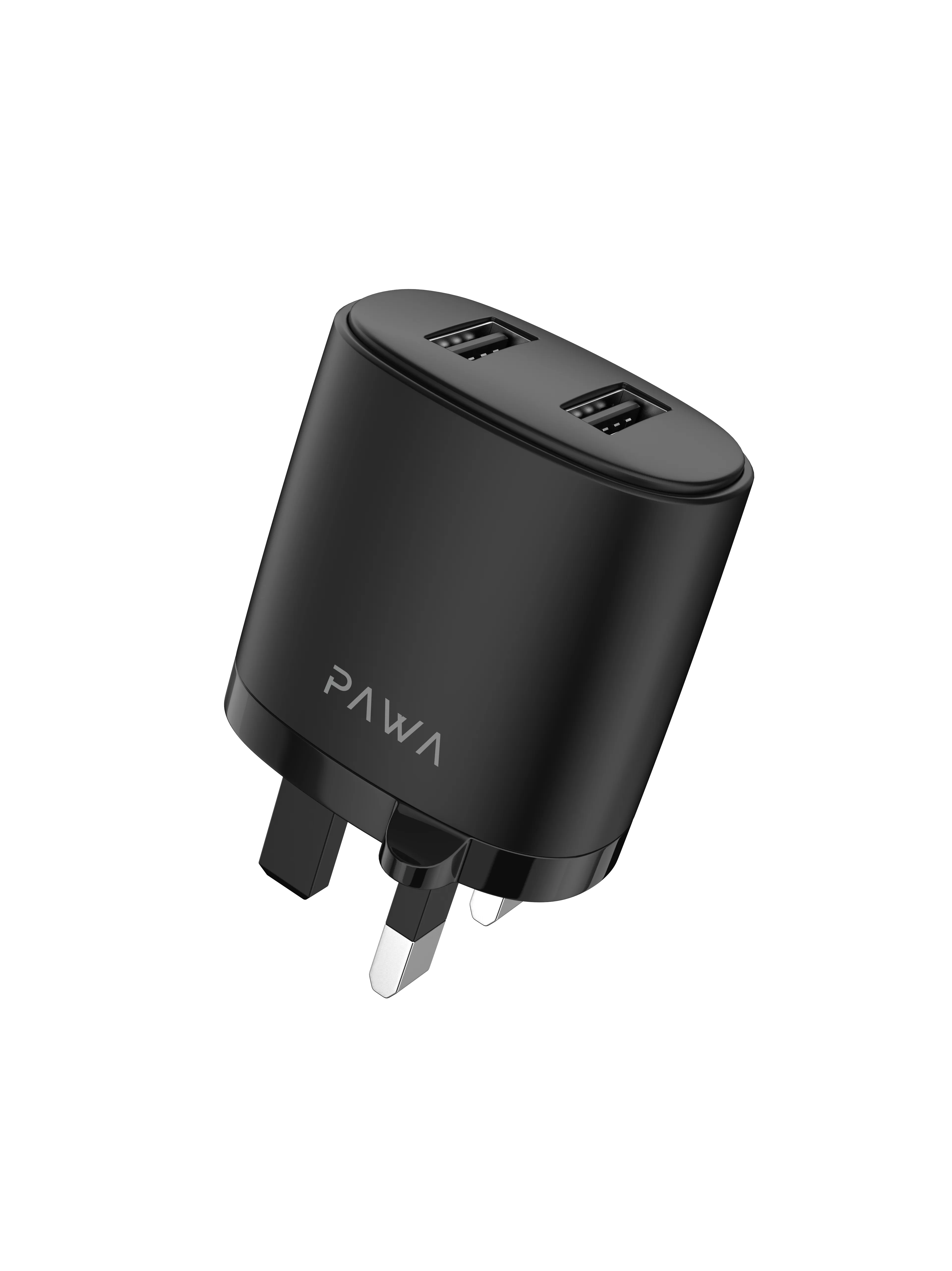 باوا شاحن جداري مزدوج بمنفذين يو إس بي (USB) مع تقنية التعرّف التلقائي (Auto-ID) بقدرة 2.4 أمبير – قابس المملكة المتحدة (UK) – مع كابل تايب-سي (Type-C) – اللون الأسود